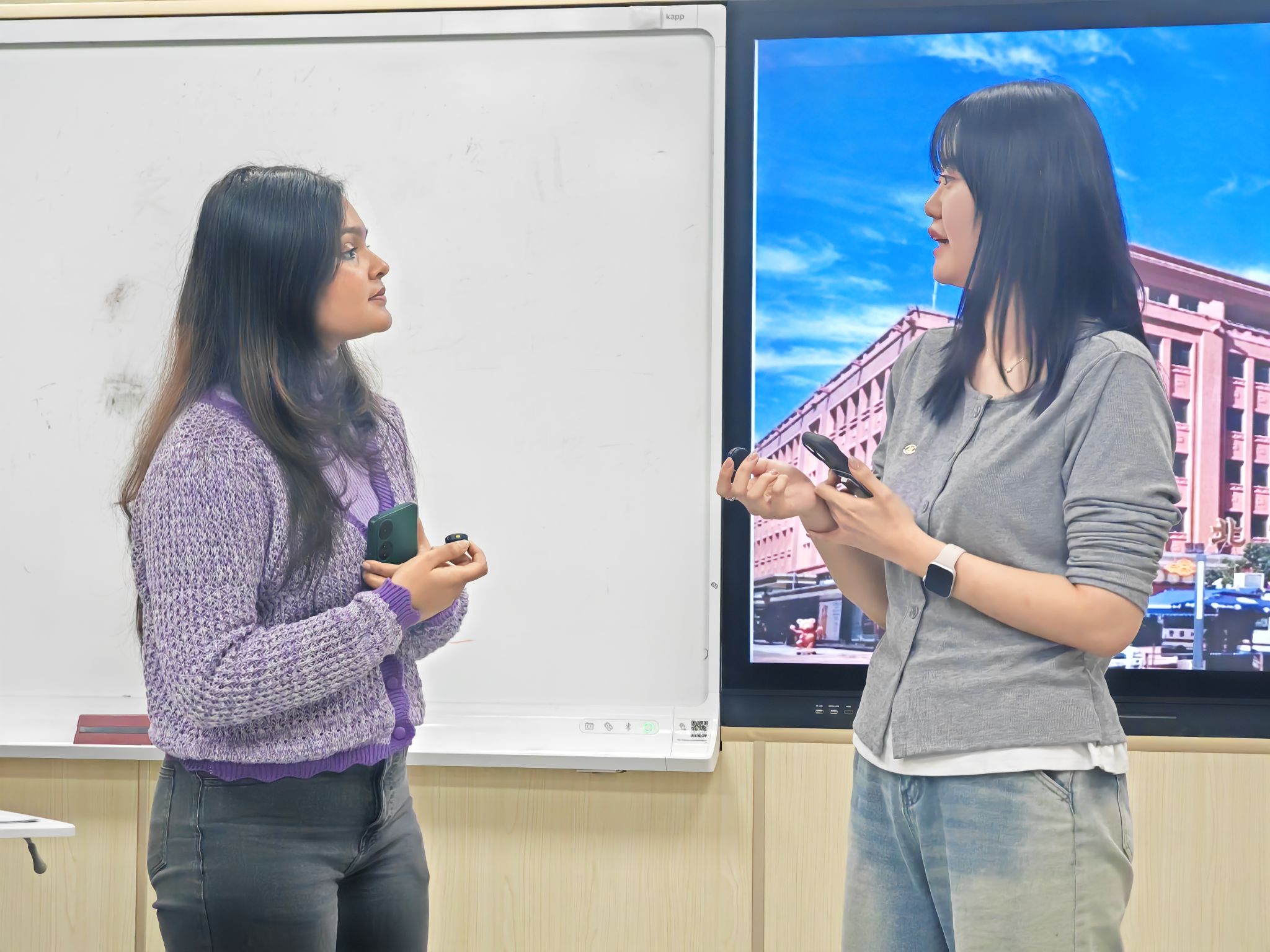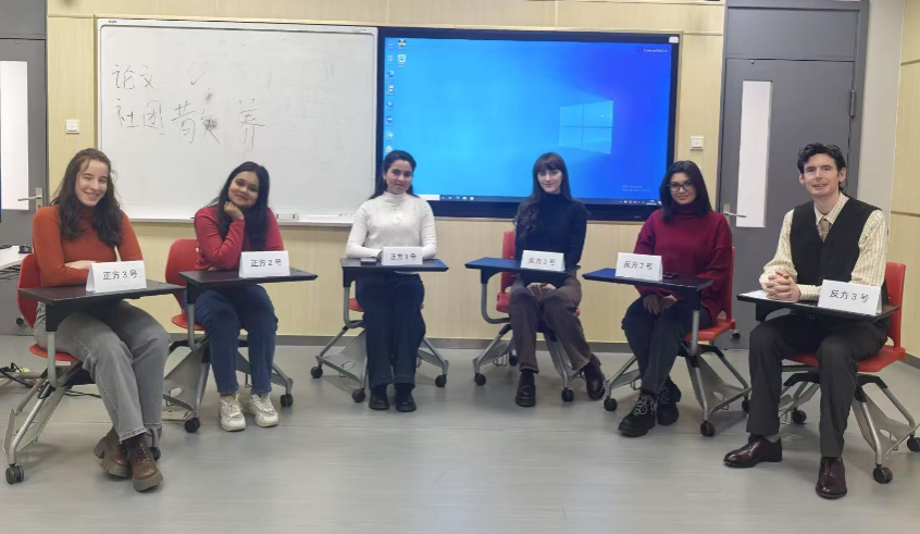我们的课程非常有意思,比如视听说课,课堂教学是通过看视频+听说技能训练+话题讨论的形式,杨楠老师选择的视频素材都来自真实的当代中国社会热点,有专题片、新闻、纪录片、访谈、综艺节目等。在课堂上我们不仅能学习语言,还能了解真实的中国社会和探索中国文化,了解发展中的中国是什么样子。而且这门课的要求不只是老师讲、学生听,每个话题都会组织实践活动,让学生们把每一节课的内容改成拍摄vlog、报告、新闻报道、辩论、演讲······课上老师给我们机会挑战自己,让我们积极站起来说话,这种挑战让大家口语水平进步很快,也更加自信。